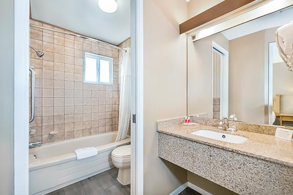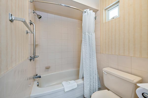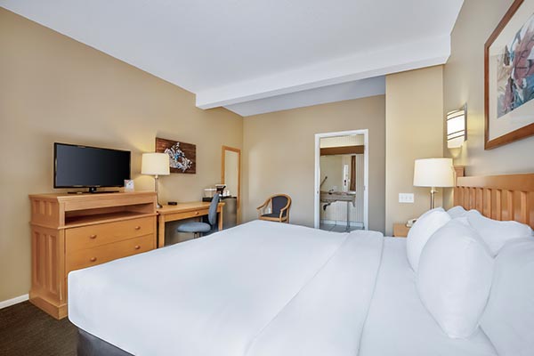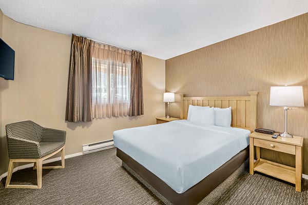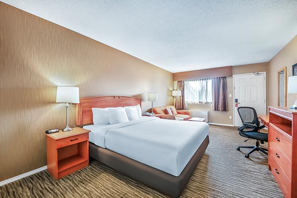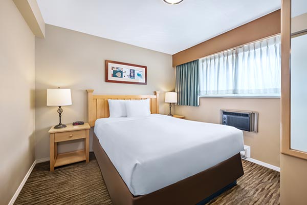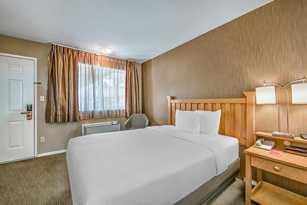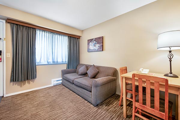 This cozy unit is great for when you need space to work or dine. It features a Queen bed, 2 burners, mini-fridge and a microwave in one large room. It’s a popular choice for seniors and those seeking extended stays in affordable North Vancouver hotel rooms. For an additional charge guests can stay in the standard king studio.