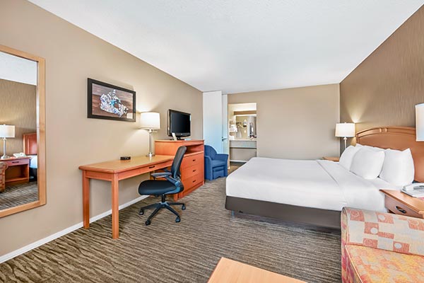This 1 King Bed room features a King bed, work desk, microwave, mini-fridge, coffee maker and a full sized kitchen. Complimentary breakfast and all of our in-room amenities are included.