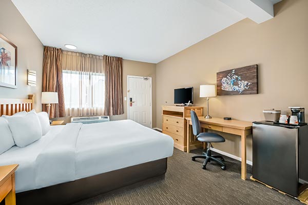 This unit offers the comforts of home and is very popular with business travellers. It features a King bed, work desk, microwave, mini-fridge and coffee maker and is perfect for 1 or 2 guests. Complimentary grab and go breakfast and all of our in-room amenities are included.