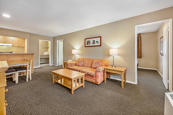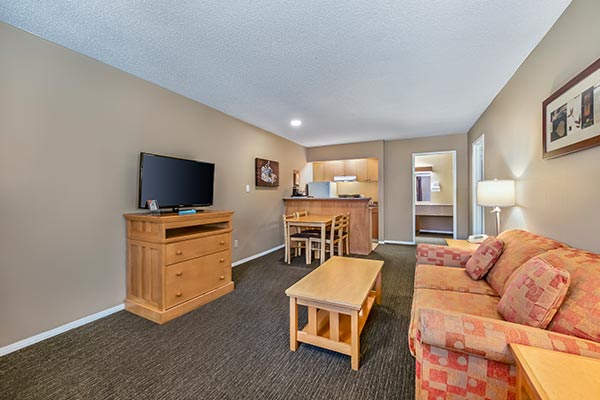 This suite is popular with young families. It features a small separate bedroom with a Queen or bed. In the living room is a Queen-size pull-out sofa perfect children. The mini-fridge, hot-plate, and microwave are perfect for snacks. Complimentary grab and go breakfast and all of our in-room amenities are included.